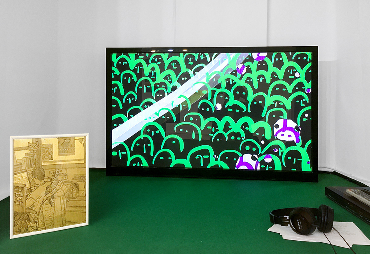 집회 장소로 걸어가던 중 저 멀리서 들리는 소리는 아직 미쳐 닿지 않은 곳을 상상하게 했다. 사진을 찍는 대신에 녹음 버튼을 누르고 광장 쪽으로 A와 함께 걸어갔다. 며칠이 지나서 녹음 파일을 다시 듣게 되었는데, 대통령의 퇴진을 한목소리로 외치는 사람들의 소리와 북소리, 행인들의 대화, 그리고 당시 A와 무심코 나눈 잡담이 그대로 담겨 있었다. 이 녹음된 소리를 반복해서 들으며 머릿속에 남은 상황에 대한 기억을 드로잉으로 옮겼다. 점을 찍거나 선을 긋고 물감을 튀기며 무수한 점을 만들었다. 잡히지는 않지만 구체적인 상황을 떠올리며 소리에 반응하는 선들을 만들었다. 이렇게 만들어진 여러 장의 그림을 연결하고 겹쳐서 영상으로 만들었다.